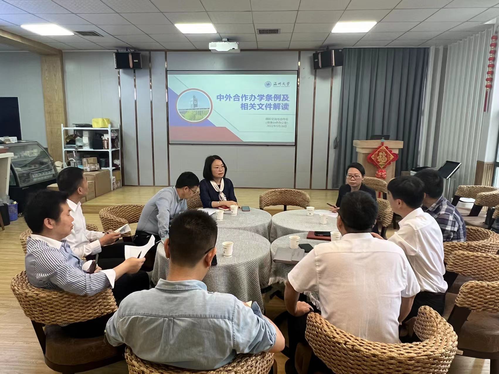 会议由杨植院长主持。杨植院长代表学院对国际交流与合作处黄文浩处长一行的来访表示热烈欢迎。黄文浩处长首先介绍了此次调研座谈的目的以及国际交流与合作处的相关工作安排,并着重介绍了中外合作办学的背景、中外合作办学条例及相关文件解读、浙江省中外合作办学情况以及推进我校中外合作办学工作思路等方面的内容。随后,赵俊亮博士详细介绍了中外合作办学机构办学成本测算。