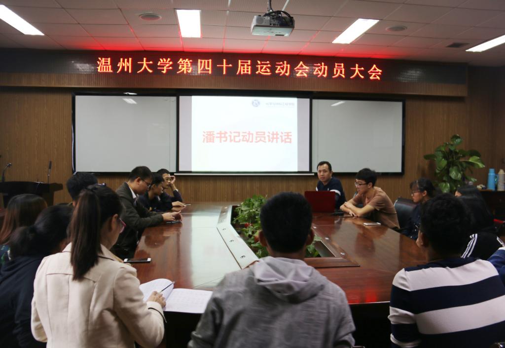 在化材楼11B204室召开第40届校运会动员大会。出席大会的有学院党总支副书记潘从义、学生科副科长易招娣、研究生辅导员邹涌彬、学生会主席章林祥及全体运动员、后勤保障人员。动员会由易招娣老师主持。