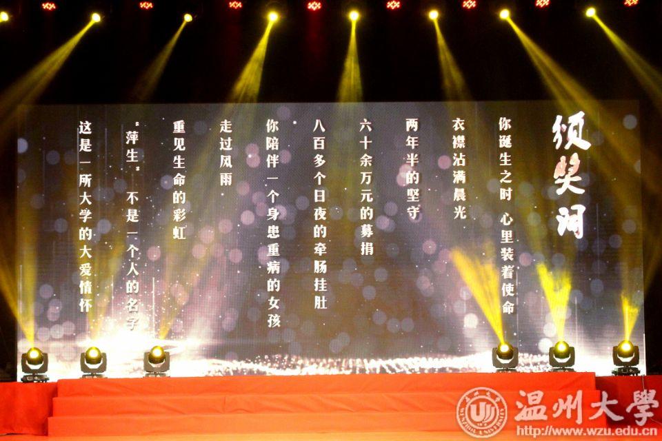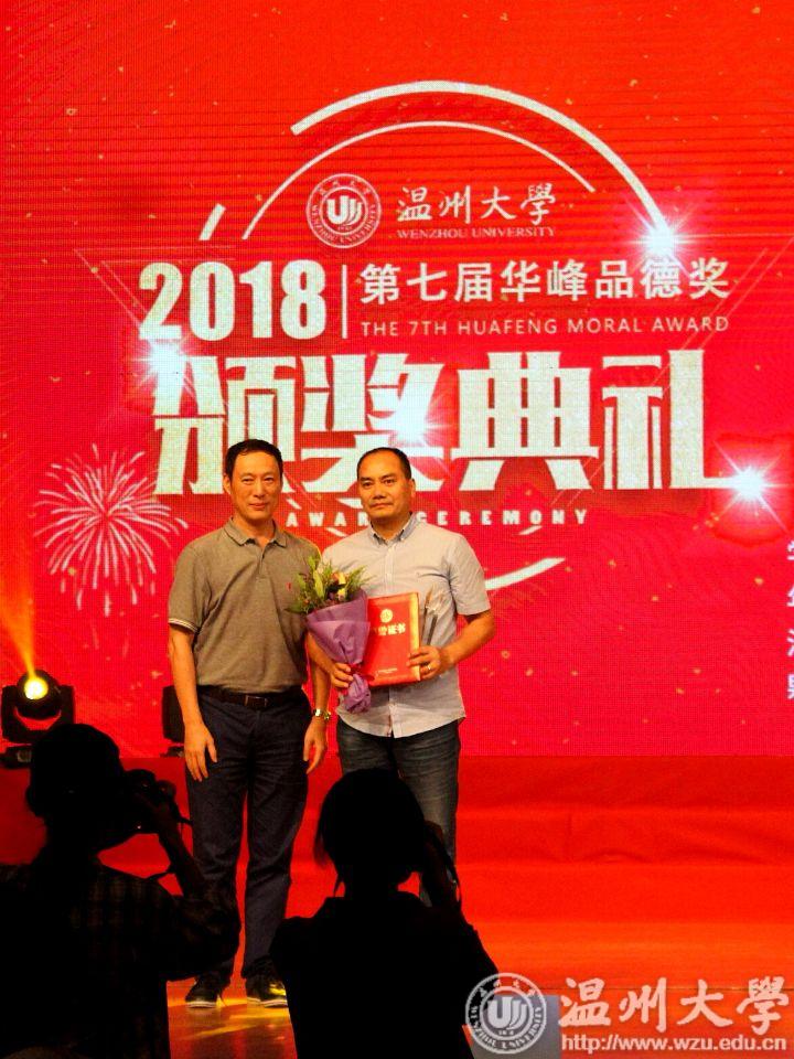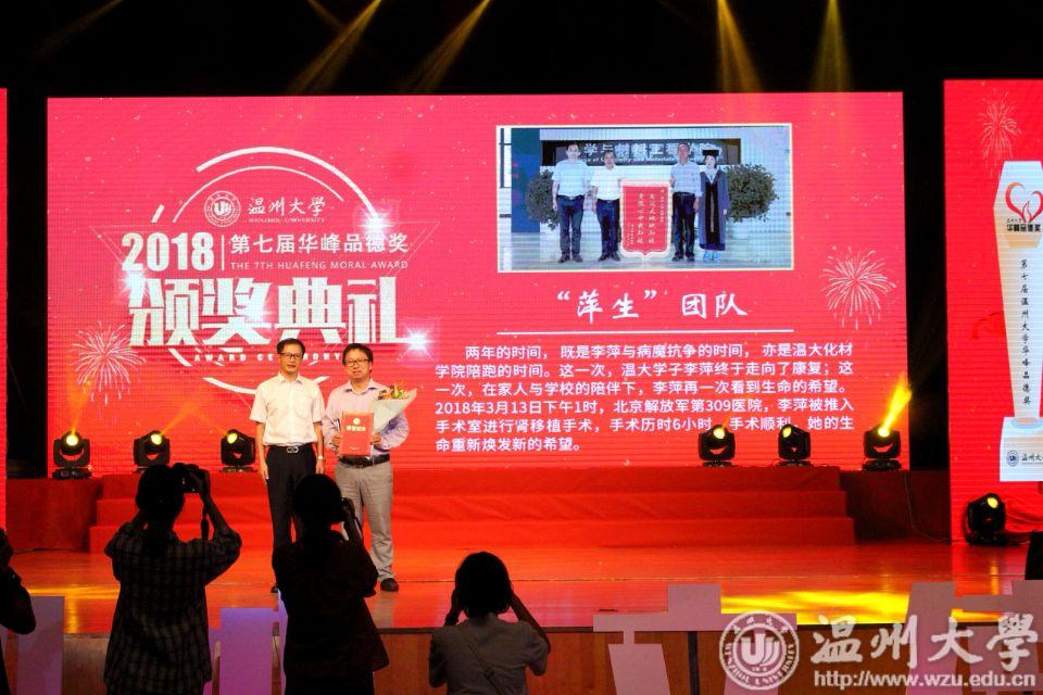 9月12日下午温州大学庆祝第34个教师节暨第七届华峰品德奖颁奖大会在育英大礼堂落下帷幕,我院张卫兵老师以及“萍生”——助力患尿毒症研究生李萍重获新生团队众望所归,荣获本届“华峰品德奖”。