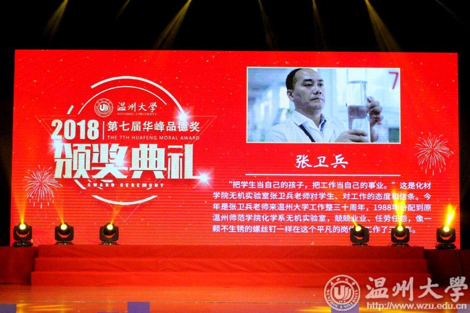 “把学生当自己的孩子,把工作当自己的事业”。这是张卫兵老师对学生、对工作的态度和信条。整整三十年,张卫兵老师扎根无机实验室这个平凡的岗位,兢兢业业、任劳任怨,坚持创新地工作,把无机化学实验室建成为省内一流实验室,温州大学实验室的一张名片。张卫兵老师曾获温州大学“优秀共产党员”、“先进工作者”、“优秀班主任”等称号。张卫兵老师在自己岗位上努力工作、用心工作来回报这个无上光荣的职业---人民教师。
