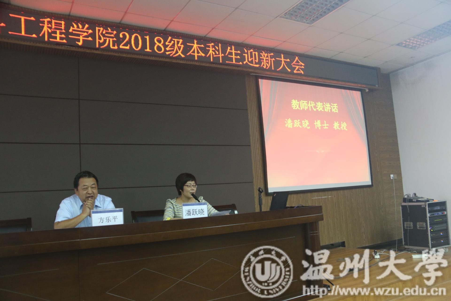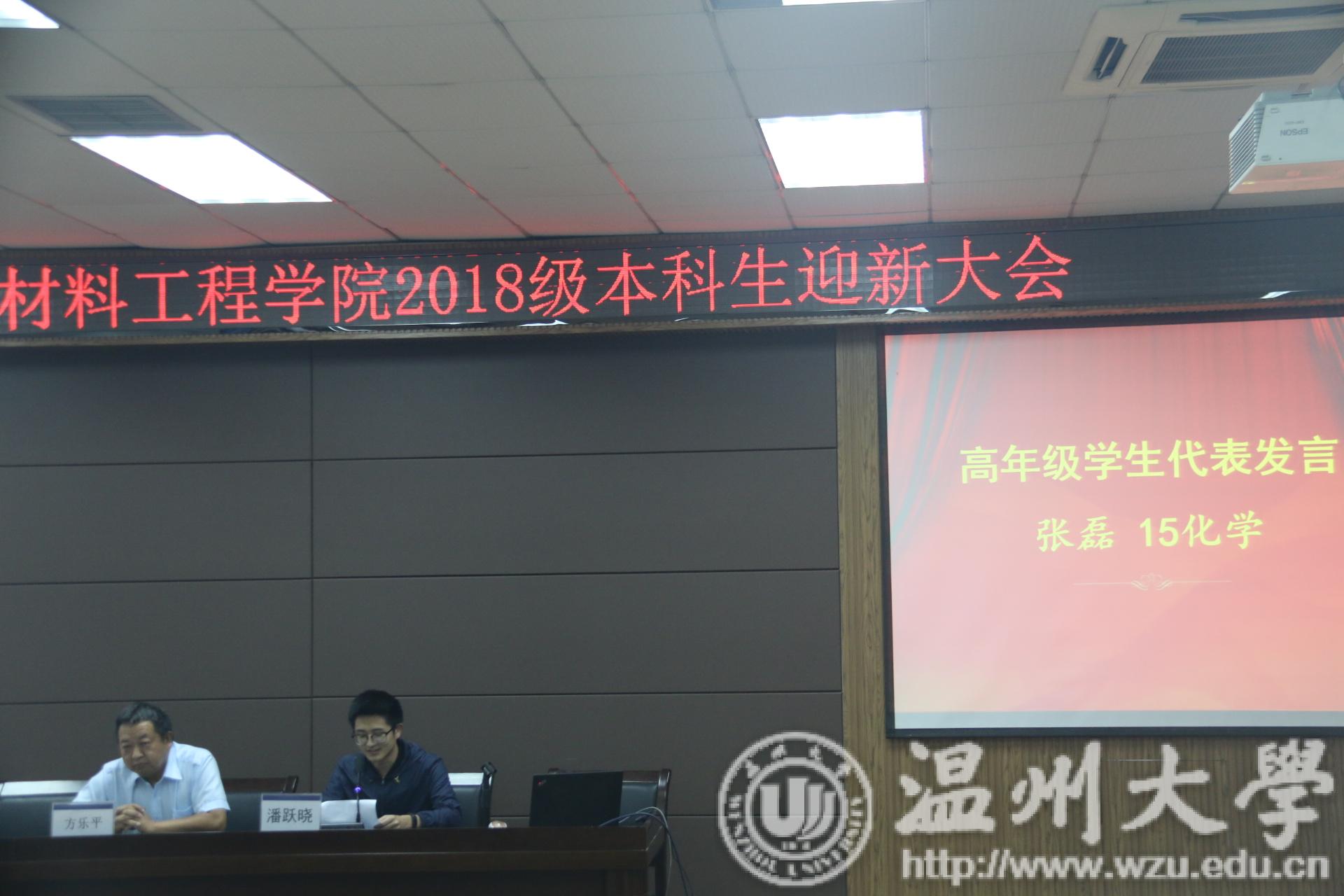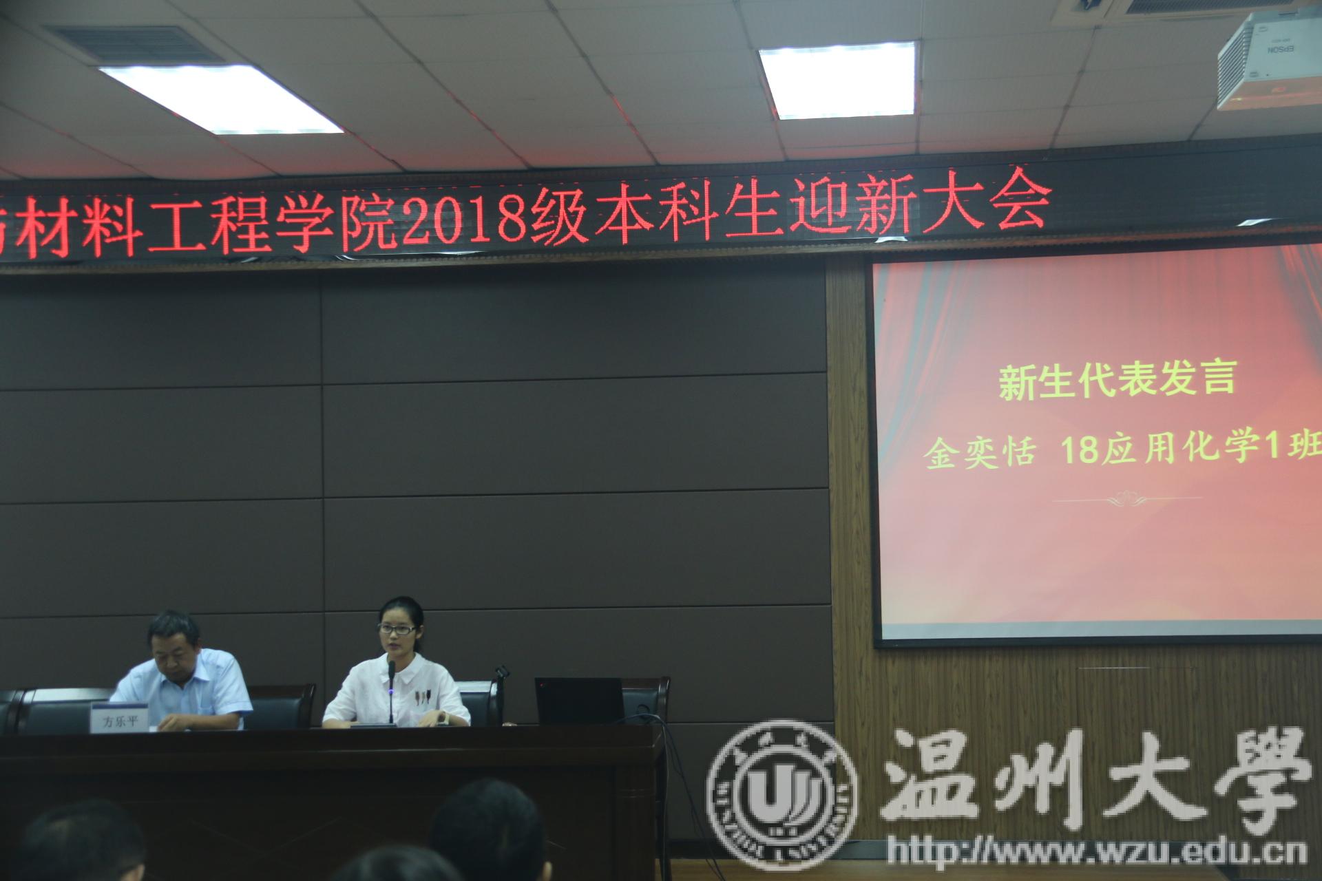 迎新大会在雄壮的国歌中拉开帷幕。大会伊始,方乐平书记代表学院所有教职工对新生的到来表示热烈欢迎,并就出席此次大会的学院领导作了一一介绍。会上,杨小平副院长着重介绍了学院的发展历史、招生情况、大学生教育工作要求等,同时对新生的大学生活表达了殷切期望,期望他们在学业上有所精进,在大学生活上不留遗憾。教师代表潘跃晓教授则结合自身求学从教经历与新生分享了她的经验与感悟,她希望新生在大学四年要抓住机遇,把握好四年的美好时光,严于律己,争取为自己的大学生活画下完美的句号。随后,15级老生代表张磊同学结合自己的学习经历,向新生们讲述了自己是如何适应大学生活、如何让自己的大学生活过的更加充实,并祝福新生们都有属于自己的精彩大学生活。18级本科新生代表金奕恬表示非常高兴加入化材这个大家庭,将带着学院领导老师的寄语和学长的祝福,努力学习专业知识,为无悔的大学生活而奋斗。