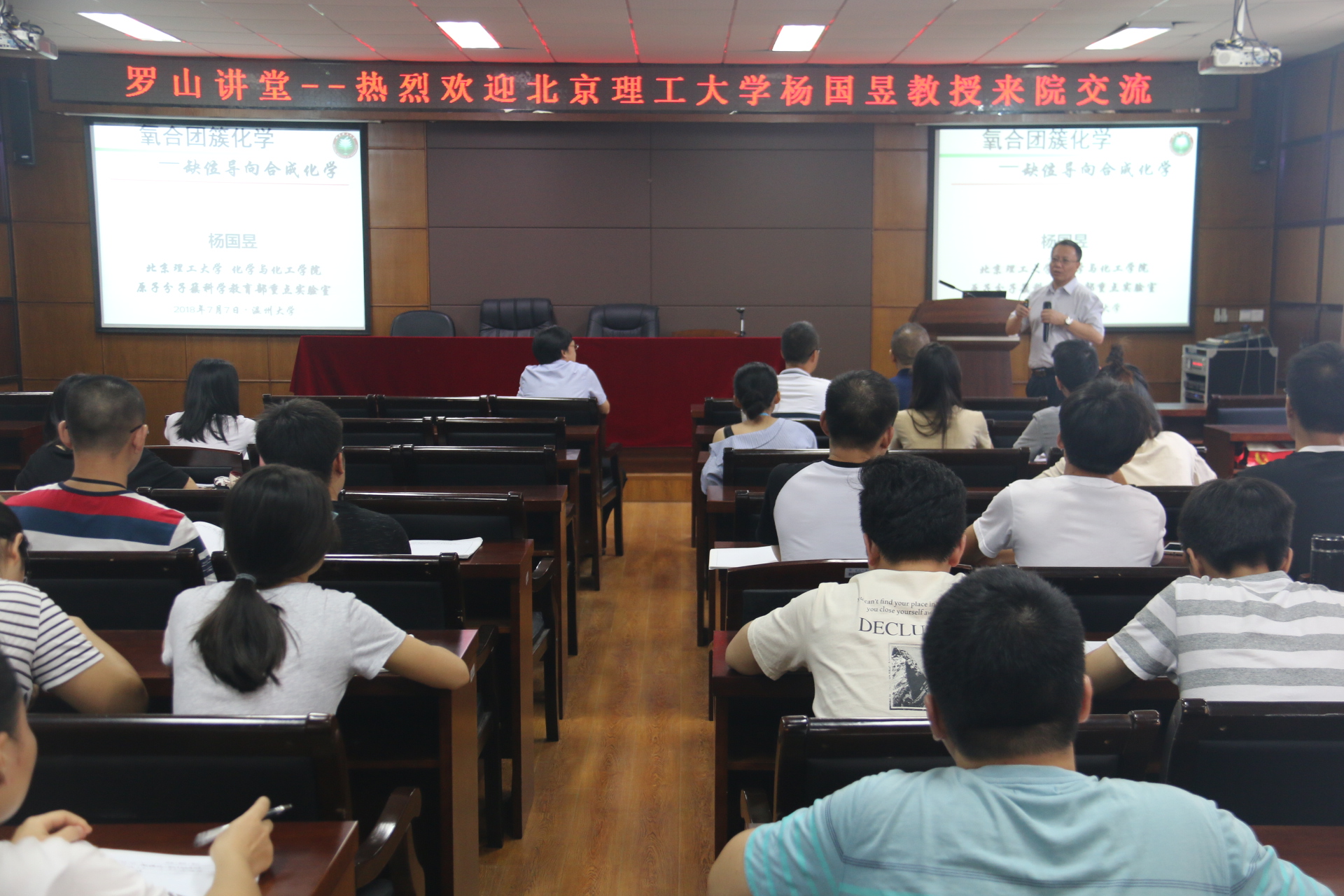 杨国昱教授作了题为“缺位导向合成化学”的主题报告。报告中,杨国昱教授首先向与会师生展示了过渡金属氧合团簇、稀土氧合团簇、储氧团簇、硼氧团簇、团簇-空旷骨骼、团簇-有机骨骼方面的研究进展,随后着重讲述了缺位导向合成在合成过渡金属氧合团簇方面的应用并加以总结。报告后,杨国昱教授认真回答了在场师生所提出的问题。