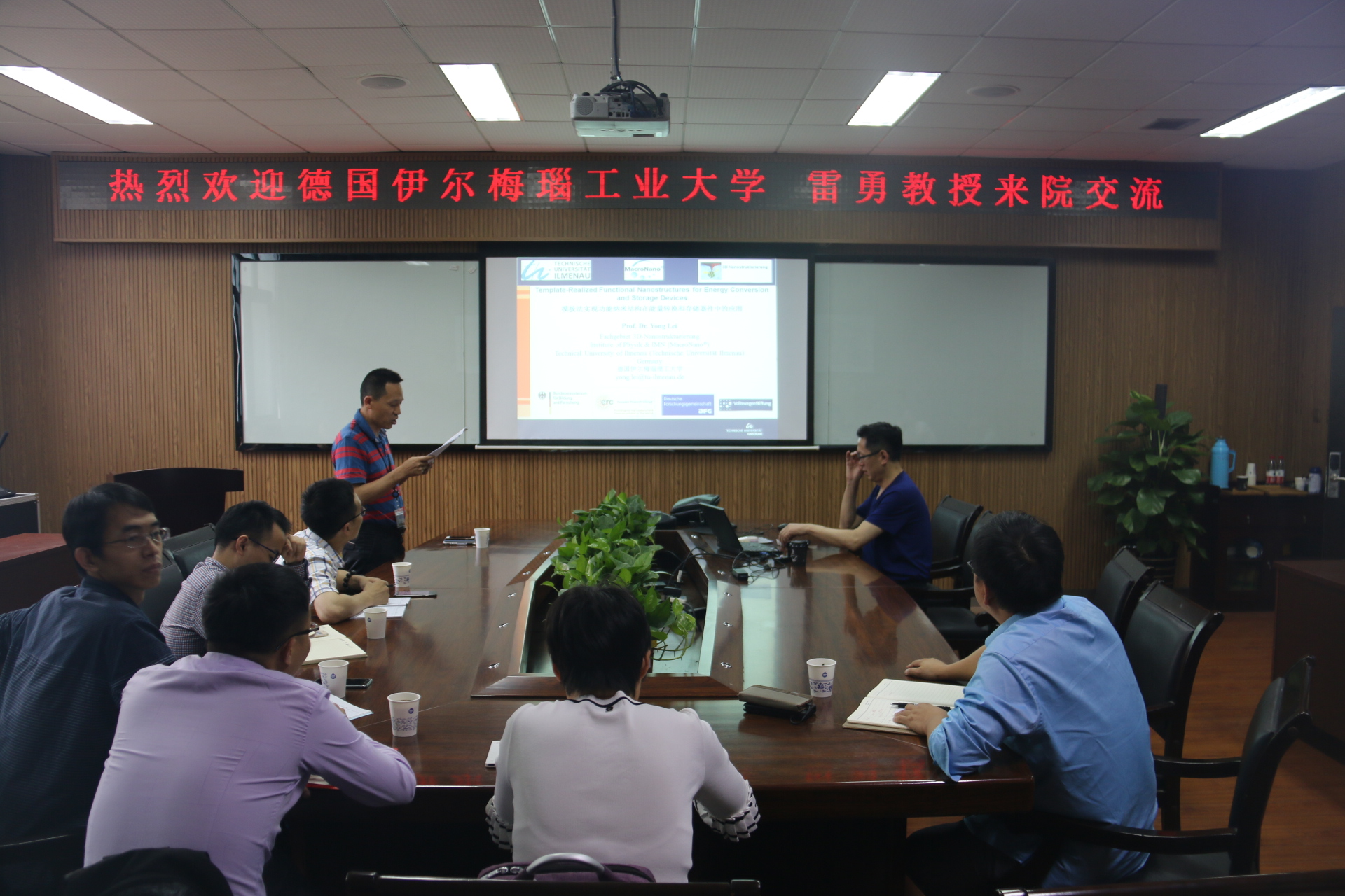 雷勇教授作了题为“模板法实现功能纳米结构在能量转换和存储器件中的应用(Template-Realized Functional Nanostructures for Energy Conversion and Storage Devices)”的主题报告,他向在场的老师及同学们分享了他博士毕业至今的科研经历和成果,并简要介绍了德国伊尔梅瑙工业大学及其所在课题组研究情况,随后重点介绍了近几年的主要研究工作,即把传统的氧化铝模板扩展成方形、二元、三元及多元结构,形成高度有序的大面积结构阵列。借助视频资料,雷教授还向大家展示了基于大面积结构阵列构筑的器件在太阳能光解水器件、超级电容器器件、钠离子电池等领域的实际应用。