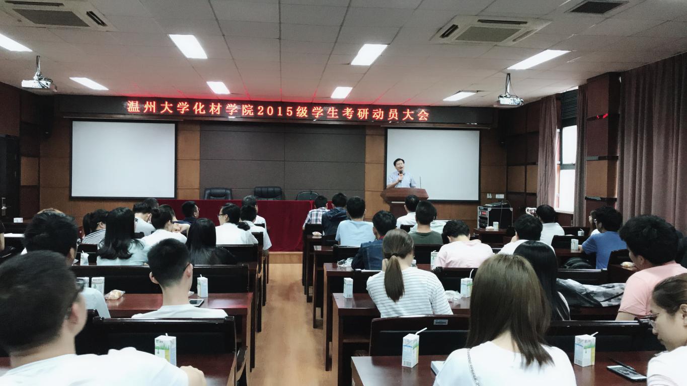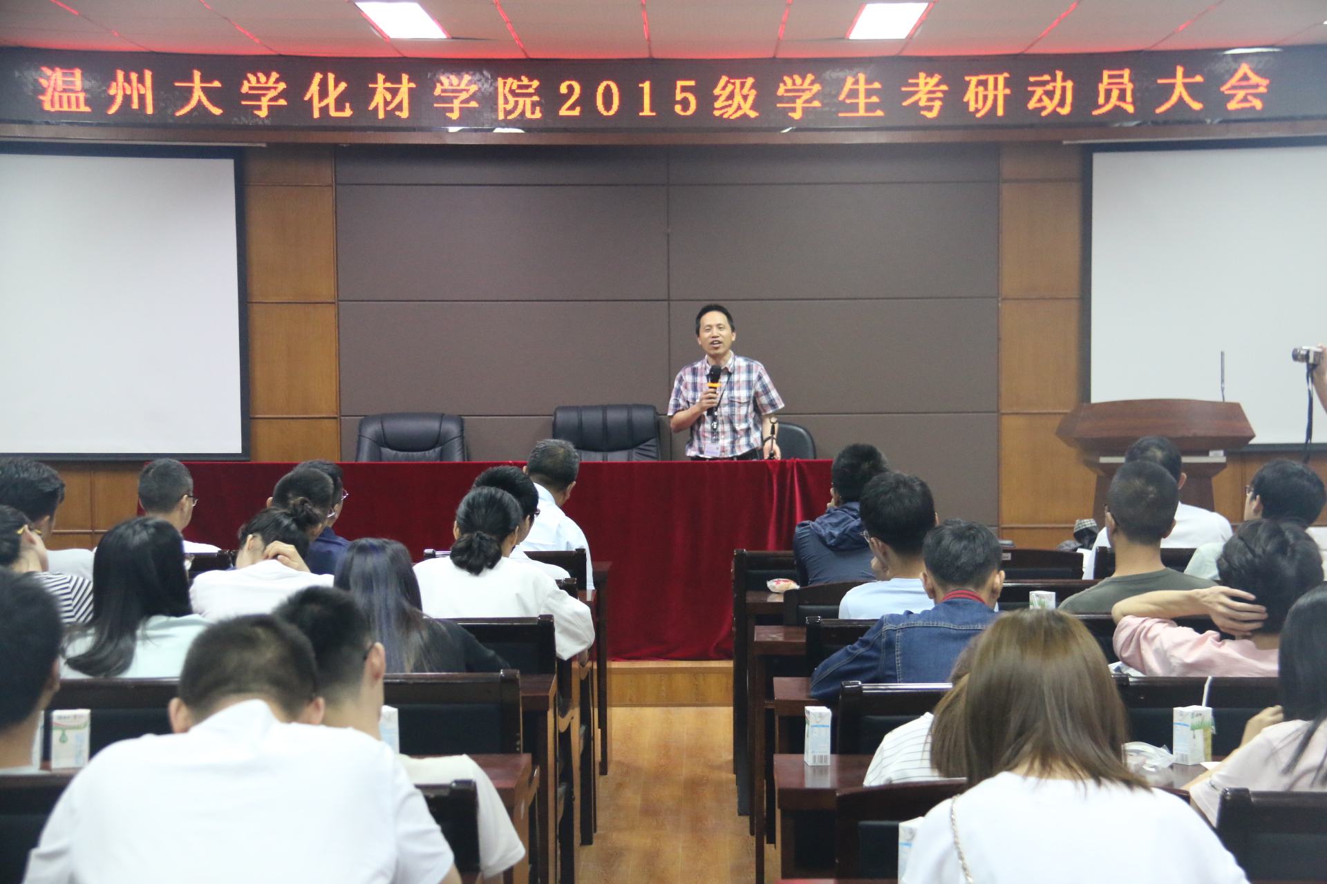 召开了2015级学生考研动员大会,出席本次会议的人员有学院院长王舜老师、党委书记方乐平老师、党委副书记潘从义老师、退休教师张力学老师、15化本班主任肖洪平老师、15材料班主任尹德武老师、学院副科长易招娣、辅导员邹涌彬老师,以及三位学生院长和全体15级考研学生,会议由潘从义副书记主持。
