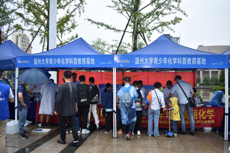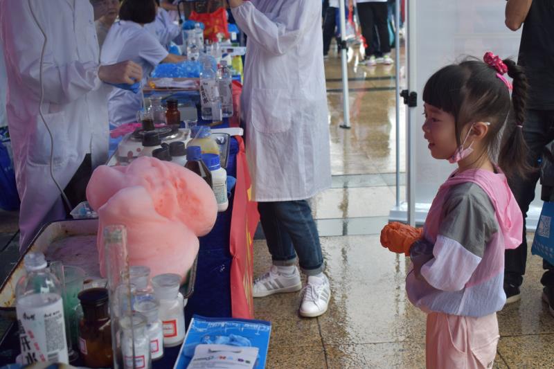 活动现场,温州大学化学科普教育基地的摊位很是热门。无论是年幼的孩子还是中学生,甚至陪同的家长也一道被摊位前展示的神奇化学实验现象所吸引并驻足观看。此外,摊位上还精心准备了“大象牙膏”、“彩色的小鸟”、“红旗插在黑面包上”等各式各样趣味化学实验,让同学们亲自动手体验。印有化学小知识的科普小册子也深受大家的喜爱。