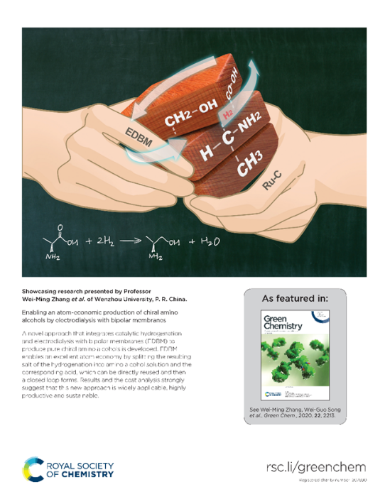 以上研究结果以“Enabling an atom-economic production of chiral amino alcohols by electrodialysis with bipolar membranes”为题,近日被选为inside back cover发表于Green Chemistry(DOI: 10.1039/ C9GC02460C)。我校加拿大28开奖