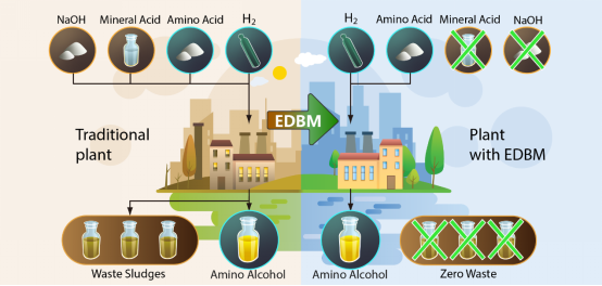 最近,温州大学张伟明教授课题组首次提出了集成催化加氢与双极膜电渗析(EDBM)的新工艺,进行了手性氨基醇原子经济合成方法的研究。以H2和L-丙氨酸为原料,通过催化加氢和EDBM最终成功地转化为纯净的L-丙氨醇产品。这个过程无需添加额外的酸和碱,无任何废弃物排放,副产物仅仅为水,具有完美的原子经济性。在此基础上,系统地研究了3种典型无机酸(H3PO4,H2SO4,HCl)体系L-丙氨醇的合成,结果表明EDBM过程无机酸的去除率均高于99.9%,且成本及能耗都较低。这表明该集成新工艺具有一定普适性,环境友好,符合绿色化学发展的要求。