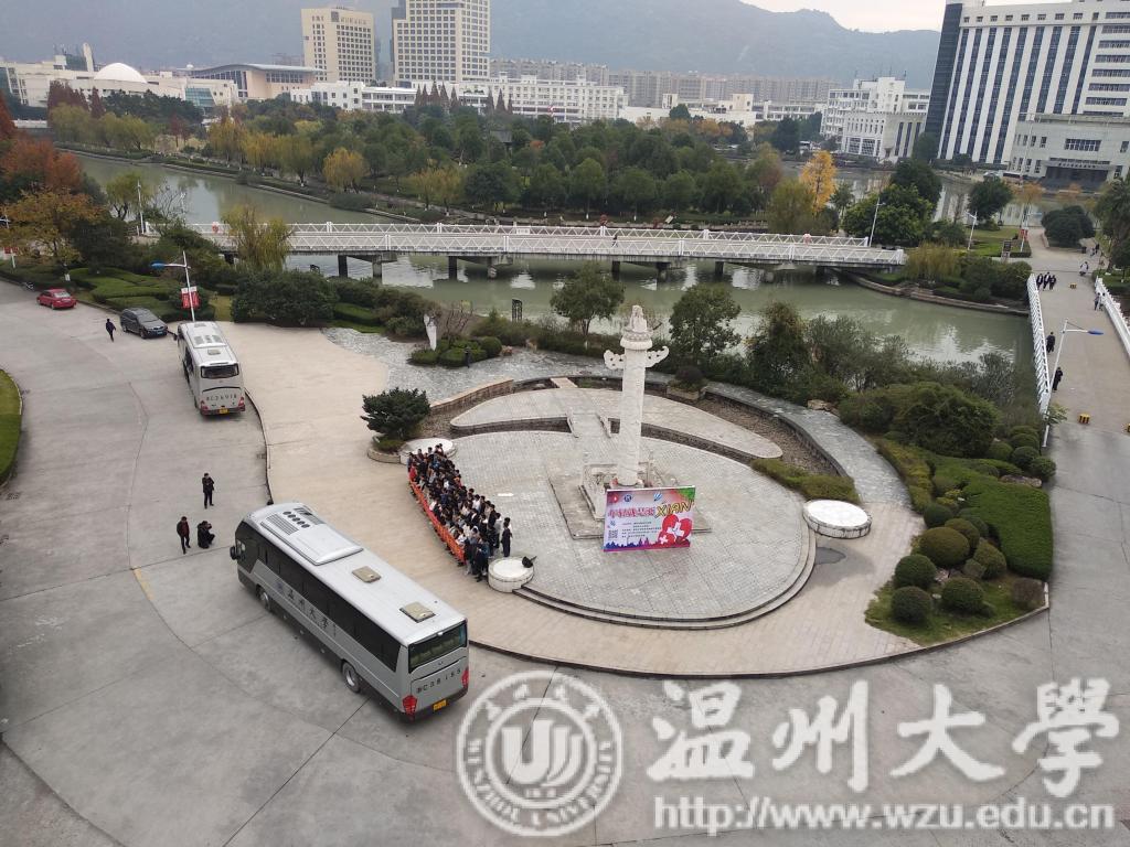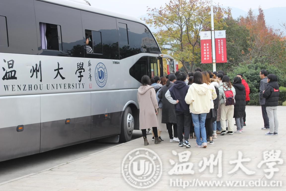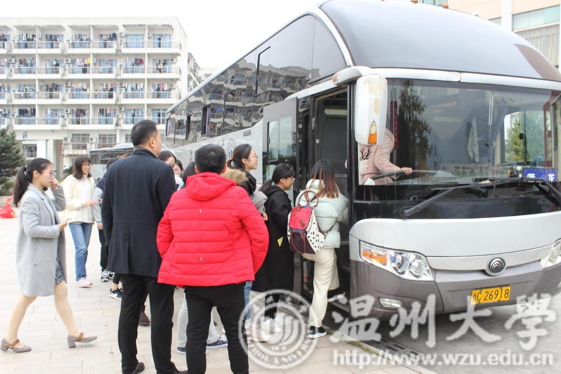 2019届毕业生考研学子齐聚步青学区华表,等待学院安排送考的校车。学院党委书记方乐平、党委副书记潘从义、学生科副科长易招娣、辅导员邹涌彬、退休教师张力学和15级各班主任前来送2019届毕业生考研学子奔赴考点。