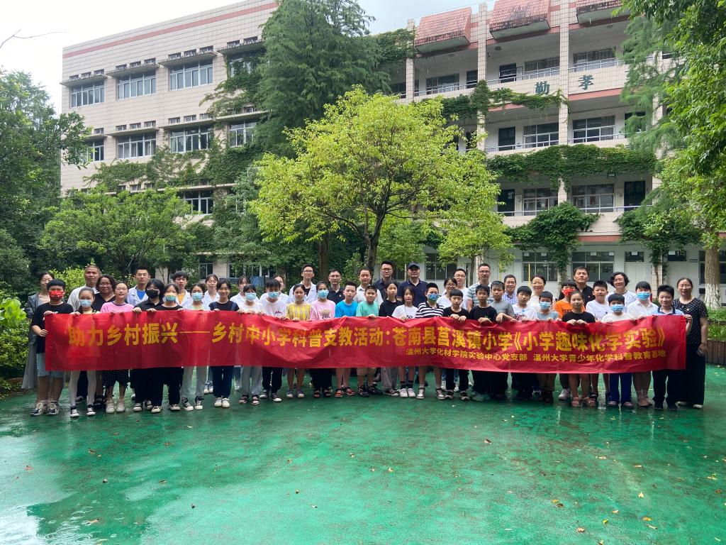 活动第三站:科普支教下乡,助力乡村振兴。我院张卫兵老师、教工实验中心党支部书记刘妙昌老师带领多位研究生、本科生党员同学走进苍南县莒溪镇小学,送来了为期三天的集科学性、知识性、趣味性、参与性为一体的“科普套餐”——乡村中小学科普支教行动——小学科学趣味化学实验。莒溪镇小学陈维鋆校长对我院师生党员的到来表示热烈的欢迎与真诚的感谢,他表示科普活动的开展很好地激发了学生爱科学、学科学、用科学的热情、同时培养了孩子多动手、勤思考、善发现、乐创造的科学素养和实践能力。莒溪镇小学也借此契机,将科技普及的种子深深植根在孩子们的心里。刘吟书记表示,莒溪镇小学是我院科普支教行动的定点学校,我院已经持续第三年对接开展系列活动,充分发挥高校服务地方的功能,力争用实际行动缩小城乡教育差距,助力乡村振兴。