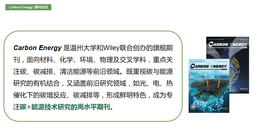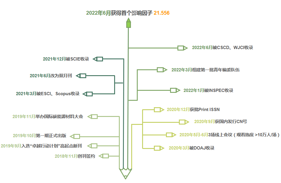 Carbon Energy自创刊以来,不遗余力地在文章内容、编校质量、宣传推广方面精益求精,一年一个台阶走好办刊之路。2019年入选中国科技期刊卓越行动计划“高起点新刊”;2020年被DOAJ、CAS数据库收录,获国内公开发行CN号;2021年被ESCI、Scopus、Inspec和SCIE收录;2022年入选CSCD和科技期刊世界影响力指数报告,在Elsevier发布的2021年引用分(CiteScore)指标中,,Carbon Energy 2021 CiteScore为16.4,在多个领域名列前茅。