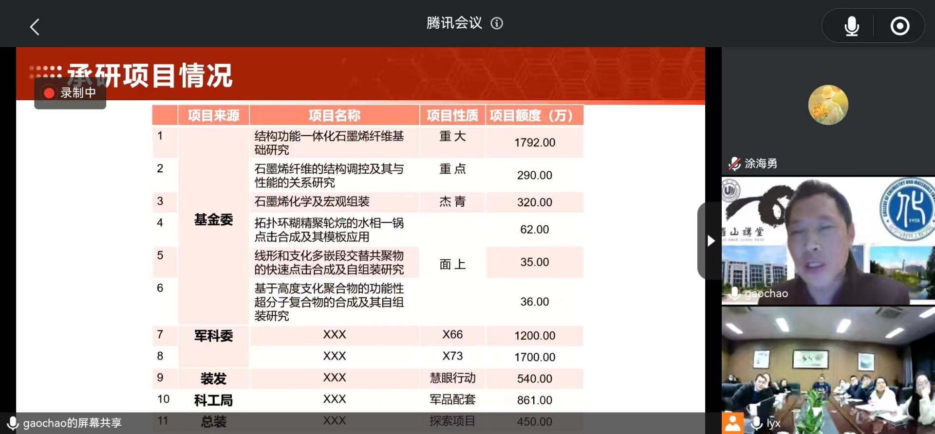 11B-208会议室线下参加,线上于腾讯会议同步展开,我校以及其他高校100多位同仁在线参加。杨植院长首先对高超教授的到来表示热烈欢迎,并向老师们介绍了高超教授的基本情况。高超系浙江大学求是特聘教授、博导,国家杰出青年基金获得者、浙江大学高分子科学研究所所长。长期从事石墨烯化学与组装材料等方面的研究。在Science, Sci. Adv., Nat. Commun., Adv. Mater.等期刊发表SCI收录文章240余篇。承研基金委重大、重点、杰青、面上,国家重点研发计划课题,军科委基础加强等项目十余项。相应成果打通了氧化石墨烯“料-材-器-用”全链条发展通路,完成了78项氧化石墨烯及其宏观组装成果相关专利权的转让,转让金额超2000万元,建成了全球首条获得国际石墨烯产品认证中心(IGCC)认证的单层氧化石墨烯生产线。曾获首2021年度浙江省自然科学奖一等奖、届钱宝钧纤维材料青年学者奖、全国发明展览会“发明创业奖项目奖”金奖等荣誉。