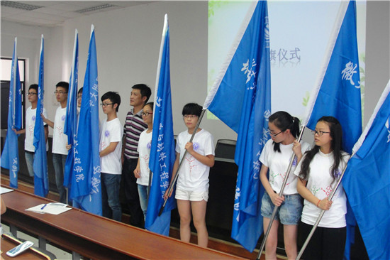 的8支实践队,其中包括4支重点团队和4支一般团队。然后学生志愿代表进行讲话。最后孙安梭老师为8支实践队授旗,全体实践队员及指导老师在一楼大厅拍摄集体照留念。