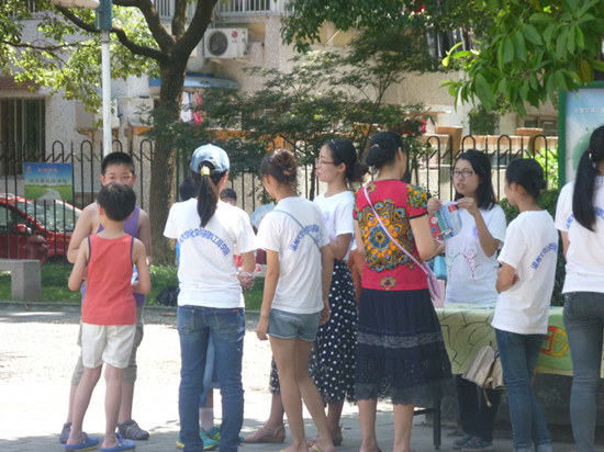 “诺亚绿舟”暑期社会实践队的队员们来到了温州市南浦街道清风社区向温州市民们普及五水共治知识。