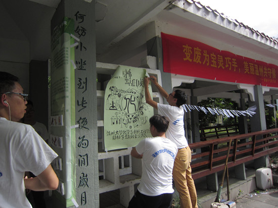 上午8:00,绿袖子实践队一行人一来到春秋社区,就迅速开始布置场地,稍后温州市城市管理与执法局环境卫生管理处的领导和工作人员也莅临春秋社区,为我们带来了帐篷椅子和水表示慰问,对我们的活动给予了充分的肯定与赞赏。在工作人员的帮助下当大家顶着烈日搭起了帐篷,挂起了横幅,并摆出队员们准备的游戏道具以及利用废旧物品精心制作的手工艺品。过往居民都被精美的手工艺品、有趣的游戏和可爱的环保袋所吸引,纷纷驻足停留。在手工艺品展示区,队员们耐心细致地向居民讲解废旧物变废为宝的制作工艺,赢得了来往居民的连声赞叹。只见这边一批居民认真思考着灯谜中的环保问题;那边一群居民则团团围在垃圾分类游戏区开展垃圾分类的小游戏。行人们纷纷表示我们的宣传办得很有意义,在作品参观中唤醒居民的环保意识,在游戏中积累居民的环保知识。活动在最炎热的时候举行,如柱的汗水中,队员们为宣传活动的完美举行而喜笑颜开。