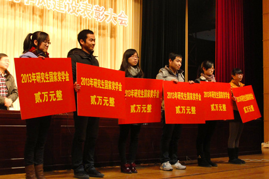 大会的第一项议程为表彰大会,由副院长王舜主持。黄少铭院长公布获得国家奖学金的研究生,并颁发奖金。此外,会议还表彰了获得第十三届“挑战杯”全国大学生课外学术科技竞赛二等奖团队和累进创新银奖的集体、浙江省第七届大学生化工设计竞赛二等奖的获奖人员、学院大学生课外科技活动评比优秀学生、2013年度校院“十佳百星”学子、校级和院级2013-2014学年第一学期优良学风班及其他奖项,与会领导为获奖班级、教师、学生颁发荣誉证书和奖品。